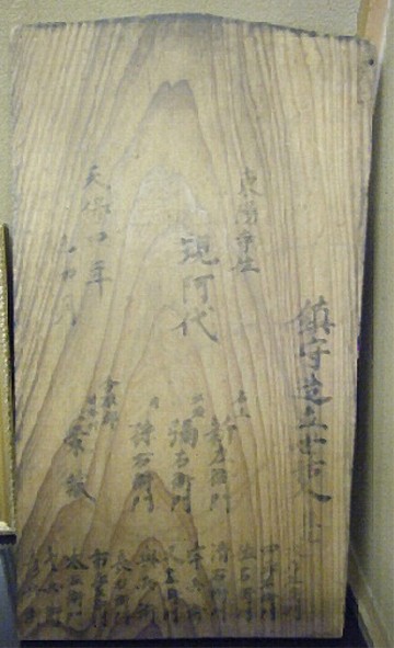 ・裏−「天下泰平 五穀成就 (梵字カ)奉再建鎮守妙見宮村内安全氏子繁盛如意祈攸 弘化四年(1847)未十一月廿三日 下総国相馬郡根戸村 別当東陽寺栄寿代」とあり、天保4年後の再建を示す。しかし、その間は14年間である。天保4年の面は一般的な棟札の書式を取っていないので、後世に書かれた可能性が高い。